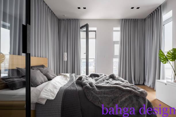 Luxury bedroom interior with double bed and gray window curtains اترك تعليقاً / بواسطة youssef s / 2024-11-10 Luxury bedroom interior with double bed and gray window curtains
